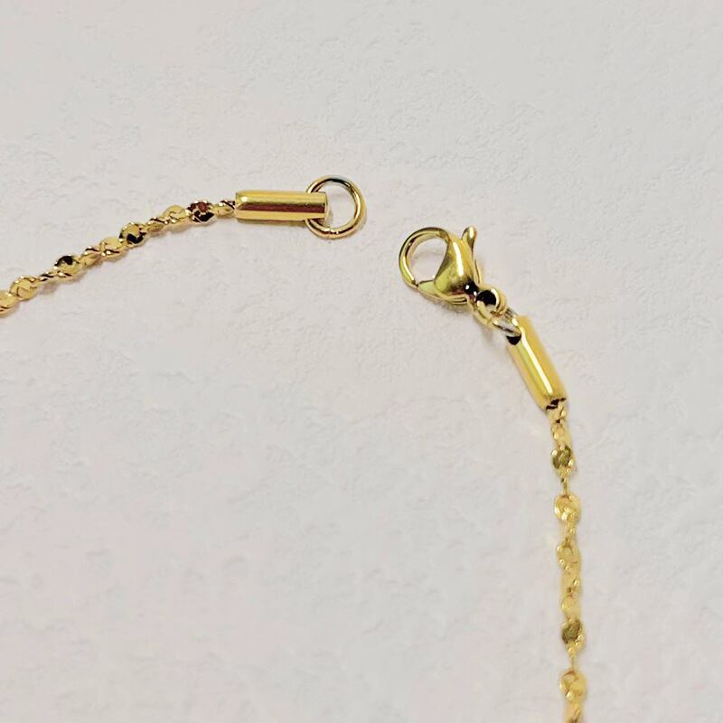 医療用によく使われ、アレルギーを起こしにくく、錆びにくいという特徴があり、お風呂や、プールでも着けっぱなしのままお使いいただけます。肌に優しく金属アレルギーがでにくいという特徴があります。